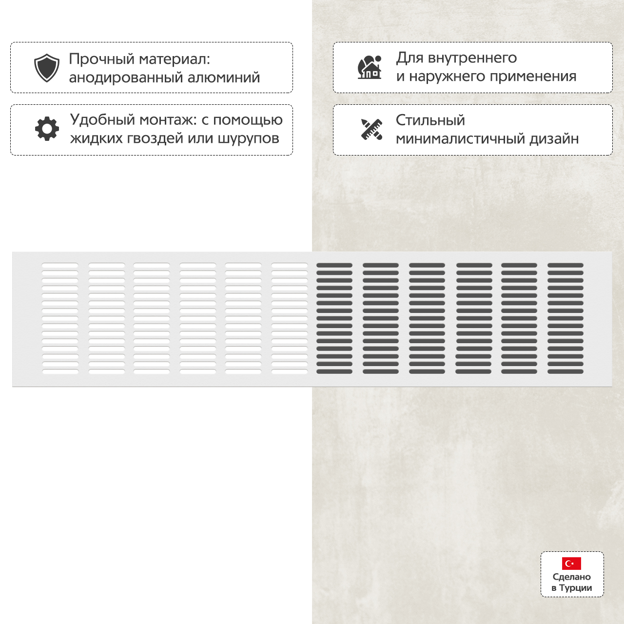 Прямоугольная вентиляционная решетка изготовлена из анодированного алюминия.