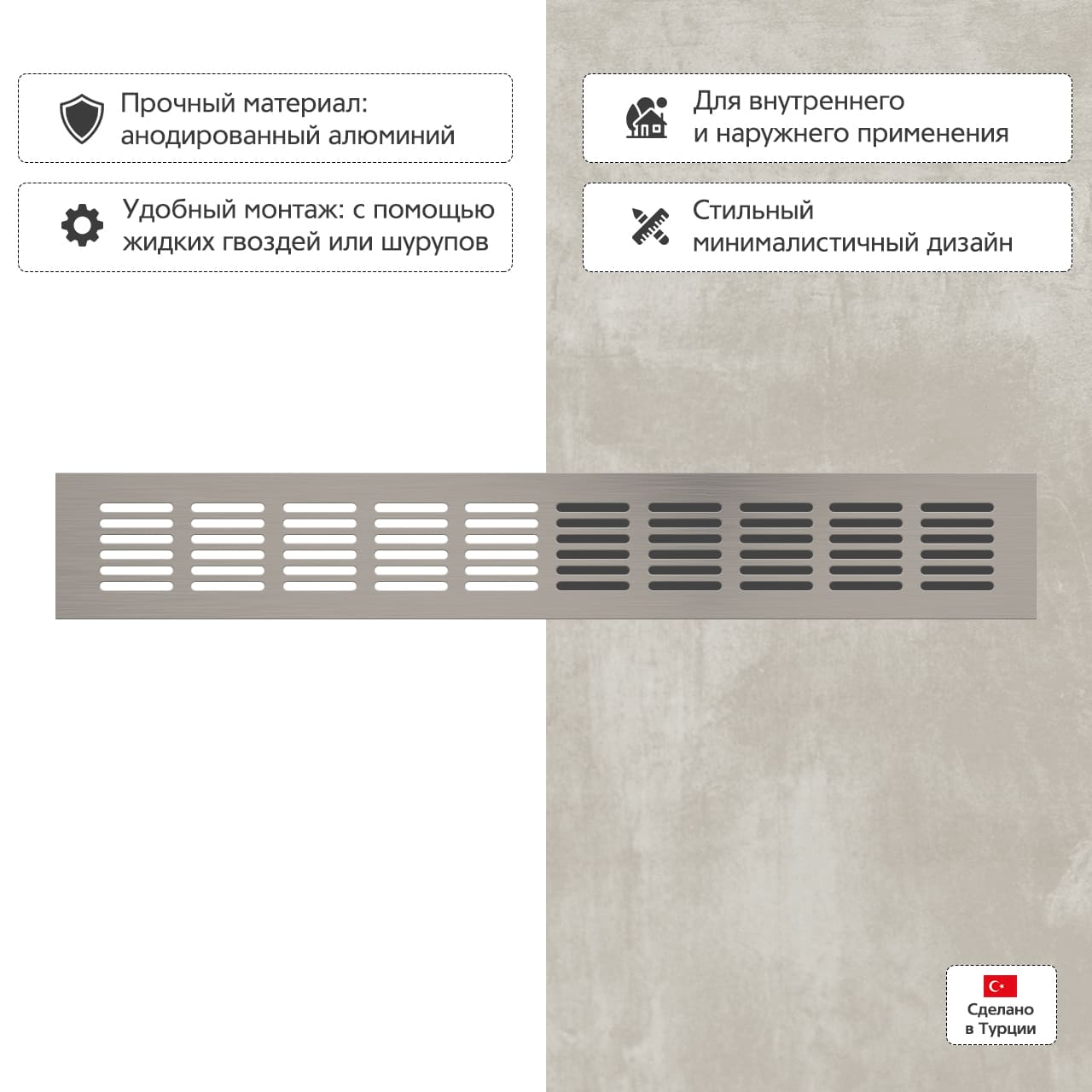 Прямоугольная вентиляционная решетка изготовлена из анодированного алюминия.