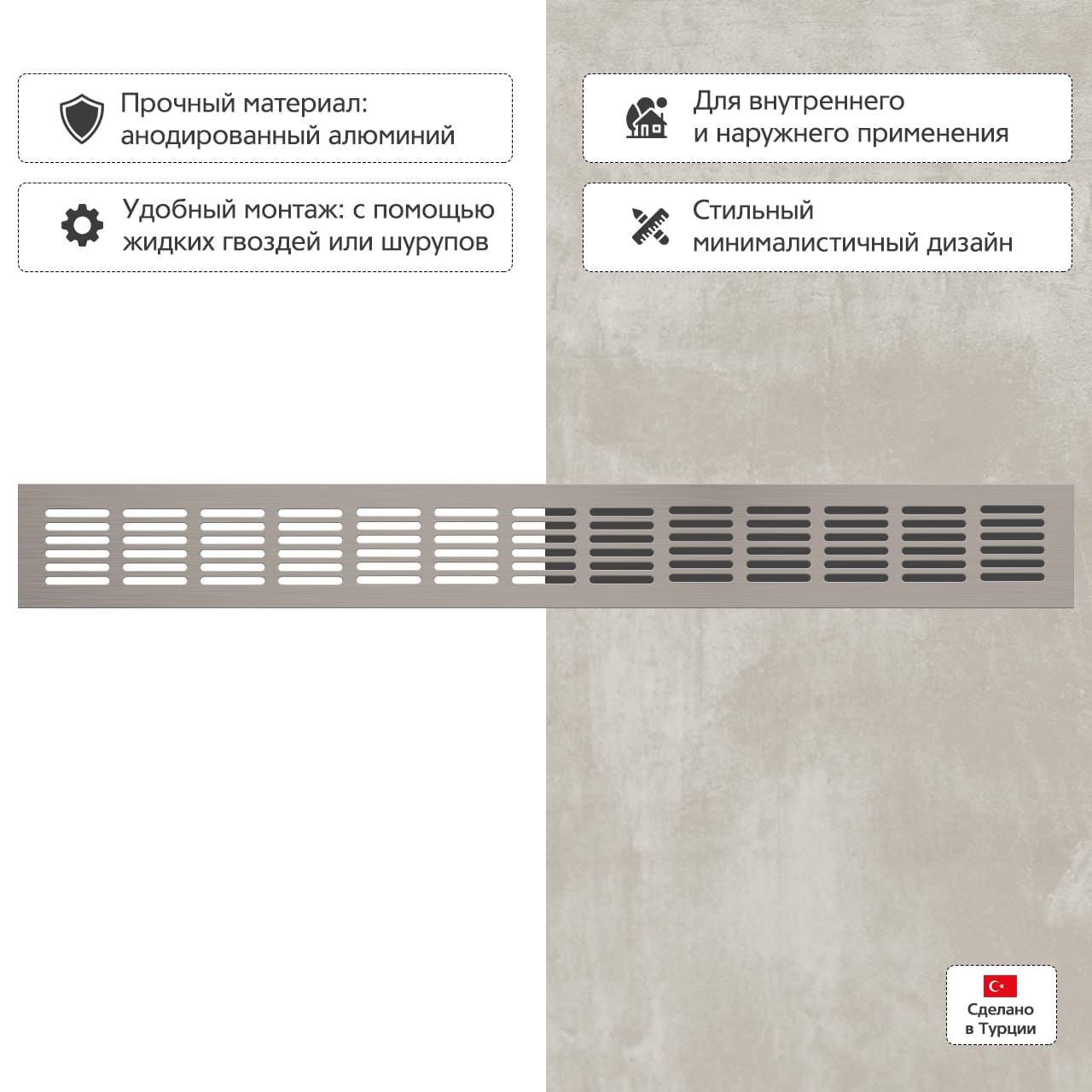 Прямоугольная вентиляционная решетка изготовлена из анодированного алюминия.