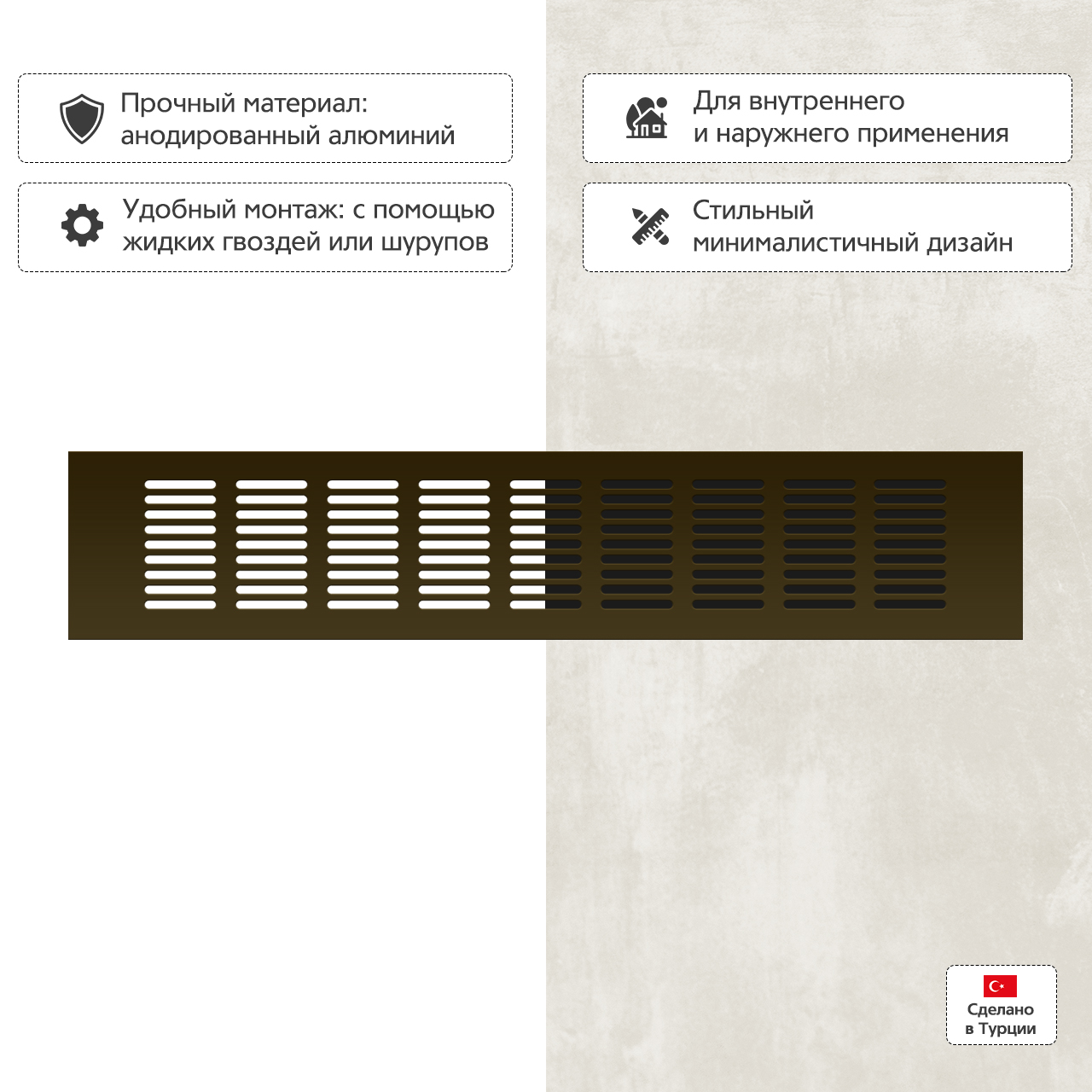 Прямоугольная вентиляционная решетка изготовлена из анодированного алюминия.