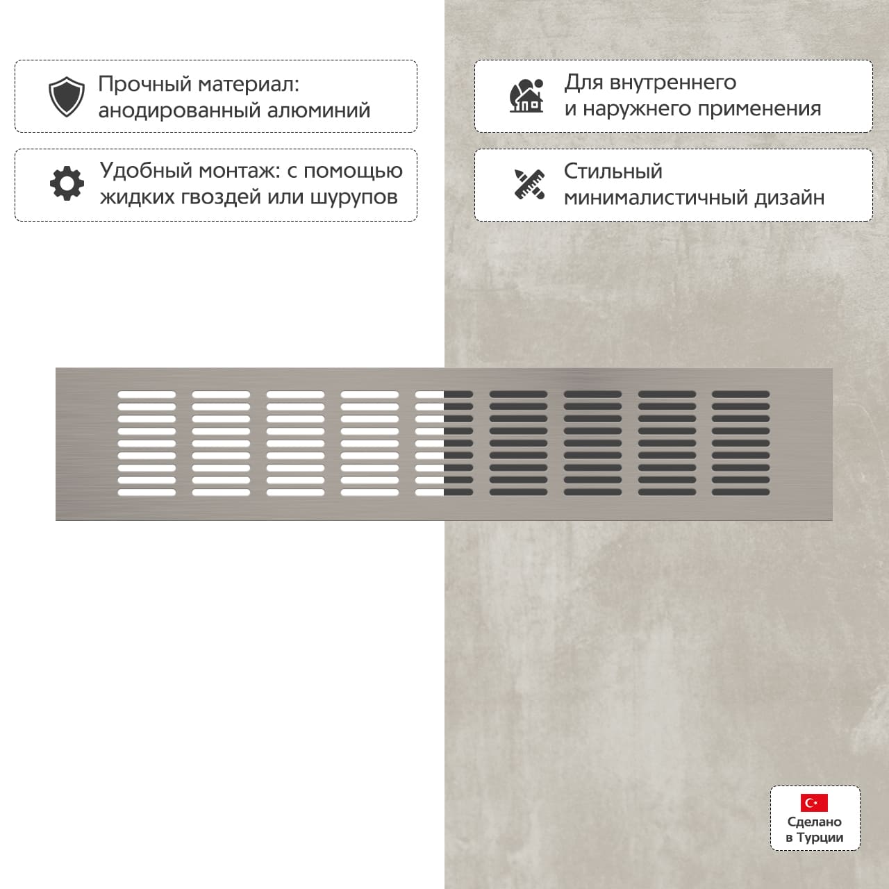 Прямоугольная вентиляционная решетка изготовлена из анодированного алюминия.
